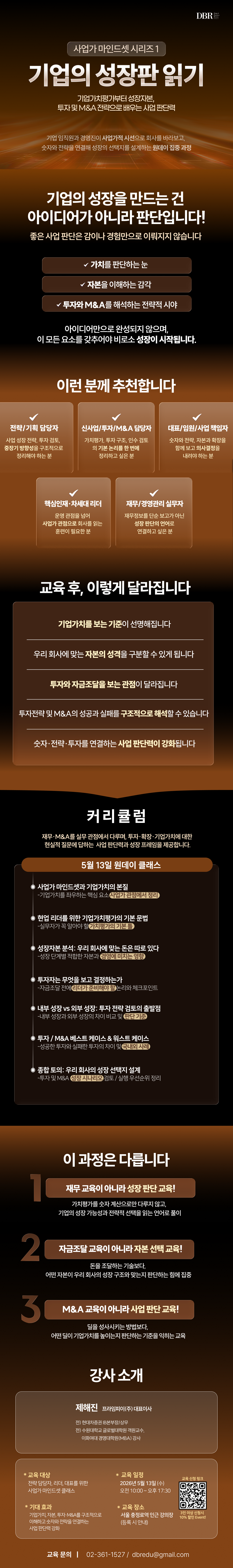 전략 담당자, 사업기획자, 대표, 임원, 성장 책임자가 실제로 마주하는 질문, 예를 들어 “지금 투자받는 것이 맞는가”, “이 사업은 직접 키울 것인가, 인수로 확장할 것인가”, “현재 기업가치를 어떤 논리로 설명할 수 있는가” 같은 현실적인 고민에 답하도록 설계돼 있습니다. 실무에 바로 연결되는 사업 판단력과 성장 프레임을 얻는 데 목적이 있습니다.