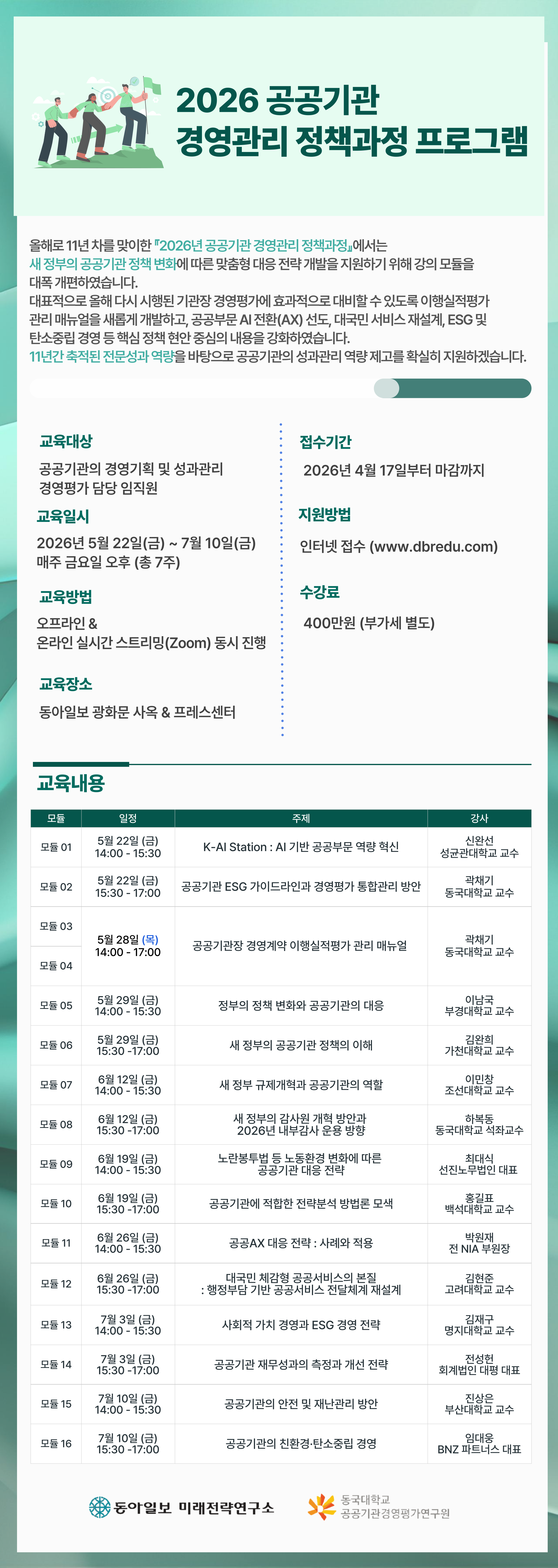 동아일보 미래전략연구소와 동국대학교가 공동 운영하는 이번 『2026년 공공기관 경영관리 정책과정』은 변화하는 경영 환경에 맞춘 핵심 인사이트를 제공합니다.